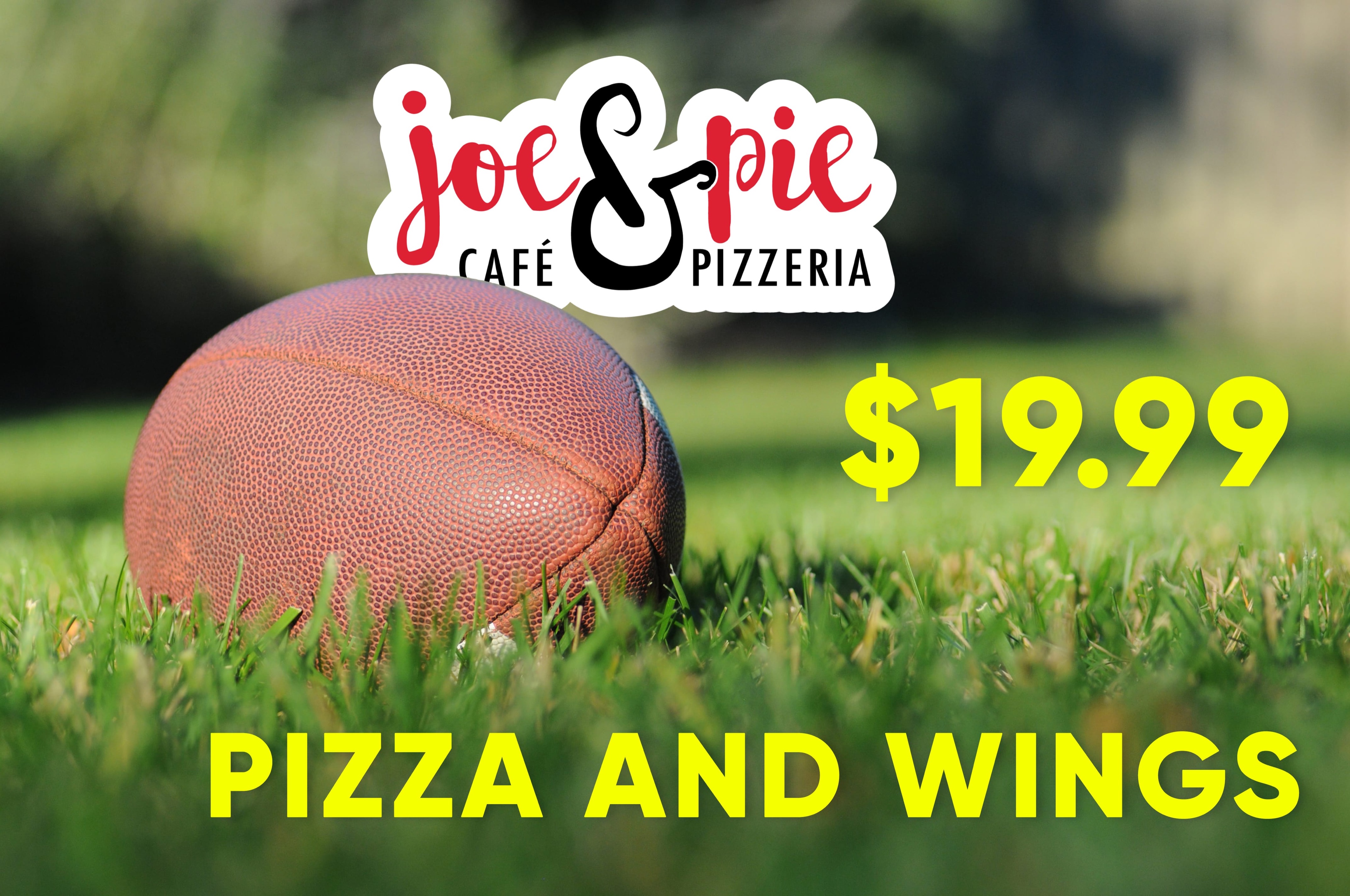 Menu :: Joe and Pie Cafe Pizzeria in Pittsburgh Joe and Pie Cafe Pizzeria Menu Menu Coupons Large 18" 16-Cut Cheese Pizza and Dozen Wings Special $21.49 Large 18" 16-Cut Cheese Pizza, 12" Sandwich and Dozen Wings Special $29.99 Large 18" 16-Cut Cheese Pizza and 12" Sandwich Special $19.99 2 Gyros and Fries Special $11.99 2 Salads Special $17.99 2 Shawarma Special $12.99