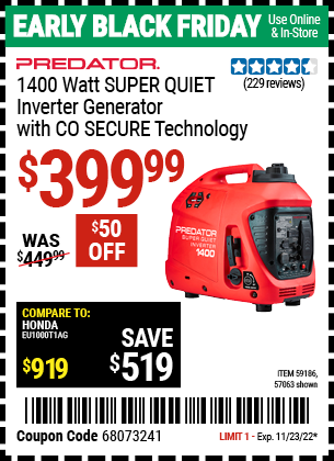 PREDATOR 4375 Watt Gas Powered Portable Generator with CO SECURE ... The PREDATOR 4375 Watt Gas Powered Portable Generator with CO SECURE Technology - EPA (Item 59207) has a 4.5-star rating on HarborFreight.com. Save on Harbor Freight's customer favorites with our super coupons. Search our Harbor Freight coupons for deals on Harbor Freight's generators, air compressors, power tools, and more.